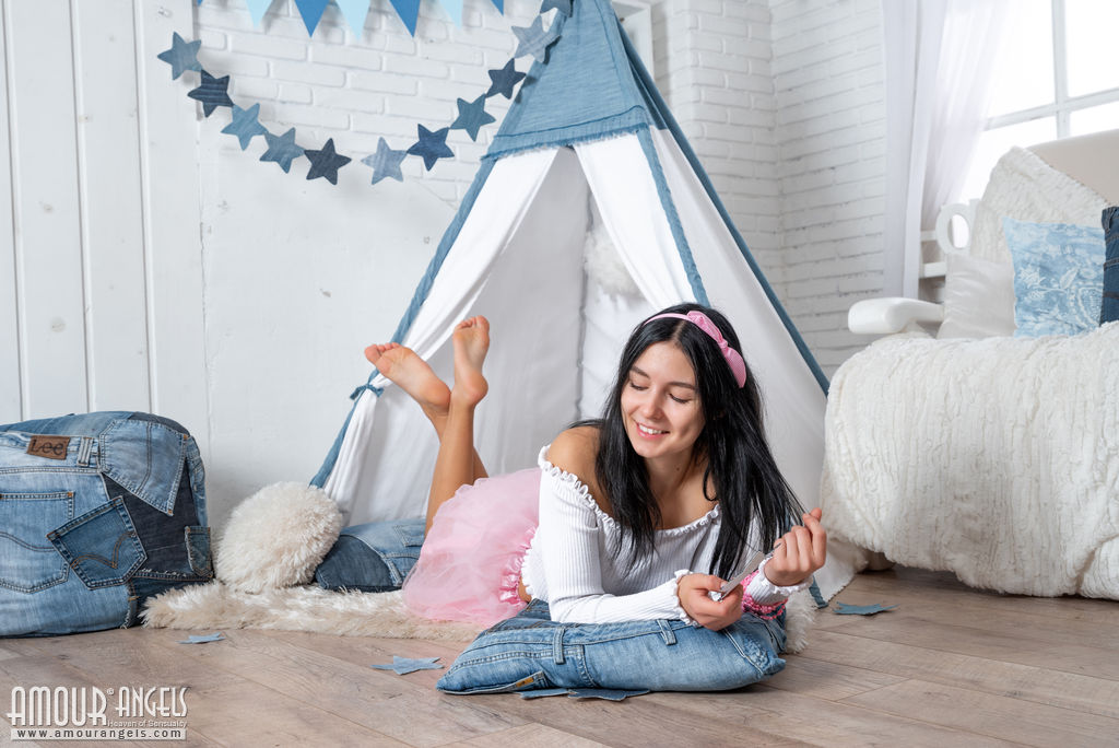 Cute looking teen model gets totally naked in front of the camera and starts playing with her incredible tits.