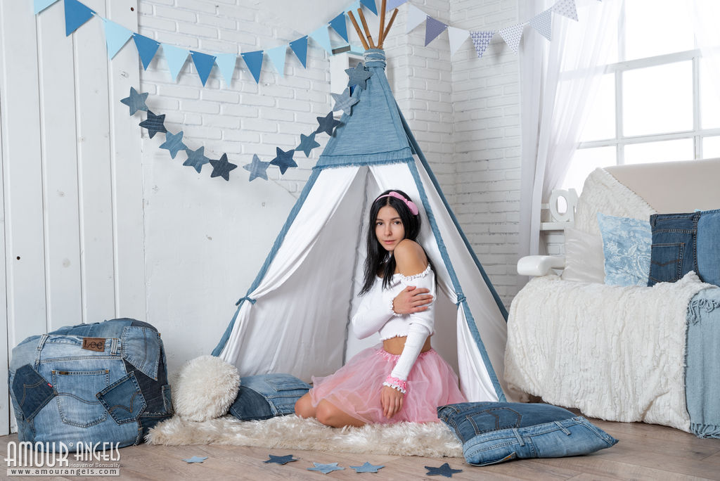 Cute looking teen model gets totally naked in front of the camera and starts playing with her incredible tits.