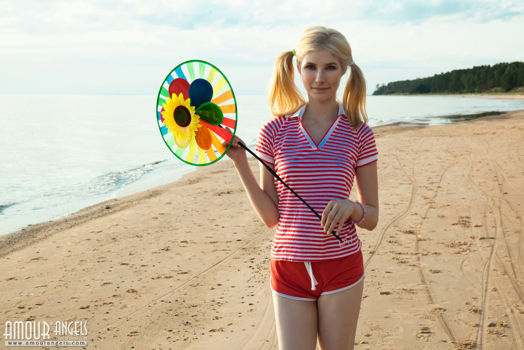 Beautiful blonde teen with ponytails and nice a nice furry vagina spreads her legs nicely on at the sea.