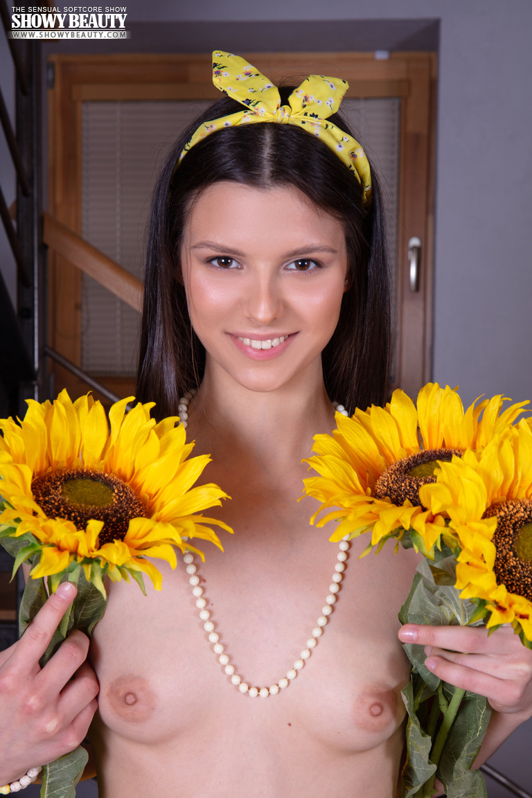 Cute looking teen model gets totally naked in front of the camera and starts playing with her incredible tits.